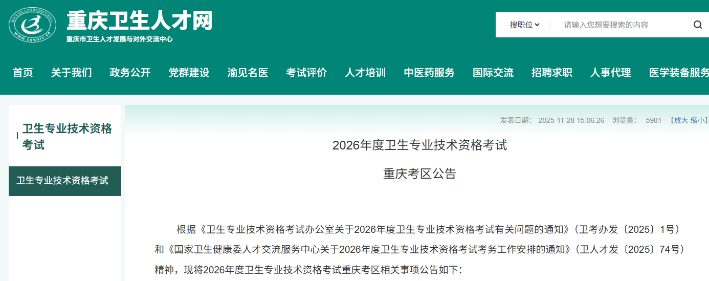 - 相关附件可查阅重庆卫生人才网(www.cqwsrc.cn),后续考试信息请持续关注国家卫生健康委人才交流服务中心官网和重庆卫生人才网。