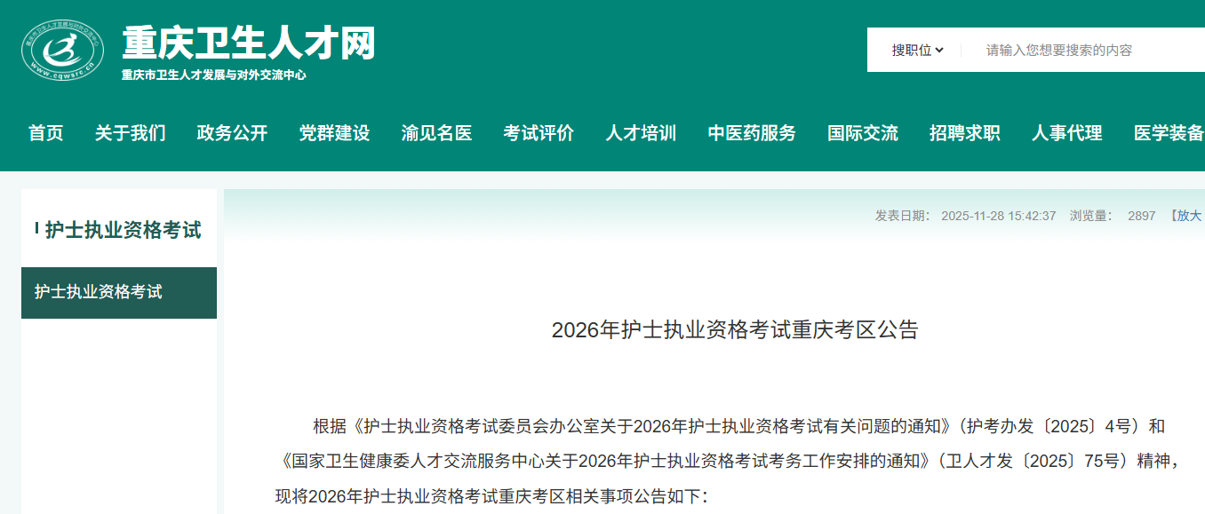 根据《护士执业资格考试委员会办公室关于 2026 年护士执业资格考试有关问题的通知》(护考办发〔2025〕4 号)和《国家卫生健康委人才交流服务中心关于 2026 年护士执业资格考试考务工作安排的通知》(卫人才发〔2025〕75 号)精神,现将 2026 年重庆考区护士执业资格考试报名及相关事项通知如下: