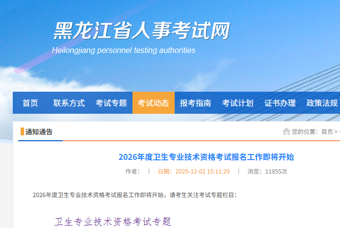 - 网上报名:2025 年 12 月 2 日 —15 日。考生需通过黑龙江省人事考试网(www.hljrsks.org.cn)“网上报名” 栏目,跳转至国家卫生健康委人才交流服务中心官网(www.21wecan.com)“考生管理平台” 完成报名,逾期系统自动关闭。