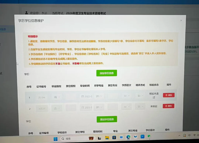 这是最常见的原因。考生在报名系统中填写的学历相关信息,如姓名、身份证号、学历层次(中专/大专/本科)、毕业院校名称、毕业专业、毕业时间、学历证书编号等,与学历证书原件或学信网备案信息不一致,都会导致核验失败。例如,毕业院校名称填写简称(如“XX卫校”误写为“XX卫生学校”的简称,或遗漏“职业技术”等后缀)、毕业时间填写格式错误(如将“2023年6月”填为“2023.6”或“2023-06-00”)、学历证书编号少填或错填数字等,都可能触发核验异常。此外,部分考生因疏忽填写了曾用名而非身份证上的现用名,或身份证号有误,也会导致身份信息与学历信息无法关联核验。