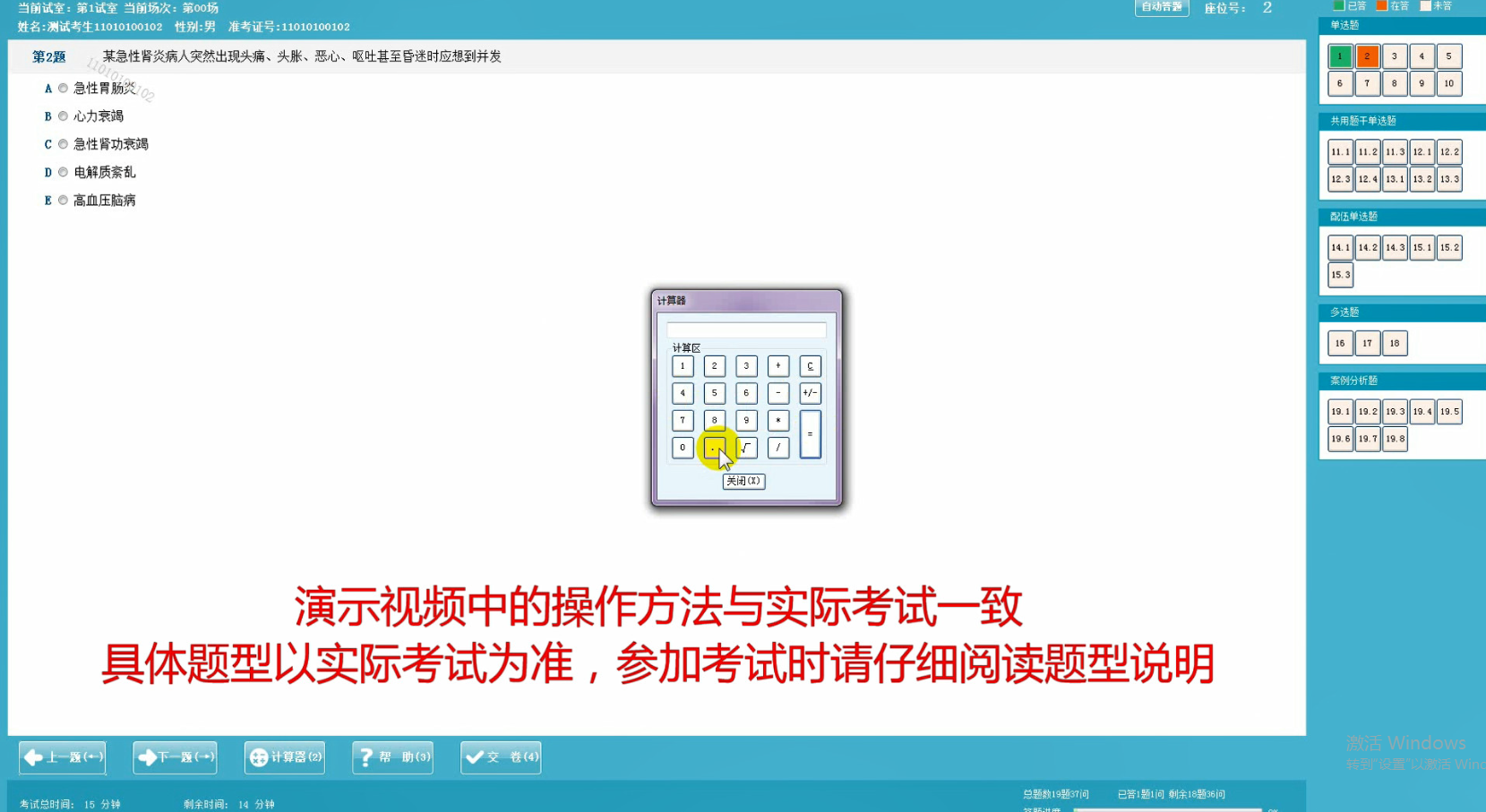 2. 作答操作:点击题目对应的选项即可完成作答,再次点击该选项可取消选择;若遇到需要计算的题目,可点击底部“计算器”按钮(或按键盘“2”键)调出系统自带计算器,操作方法与普通计算器一致,使用完毕后关闭即可。同时,可通过键盘“A-Z”键选择对应答案,重新按相应键可删除原选择答案,按“→”键进入下一题,按“←”键返回上一题(同题型内可操作)。